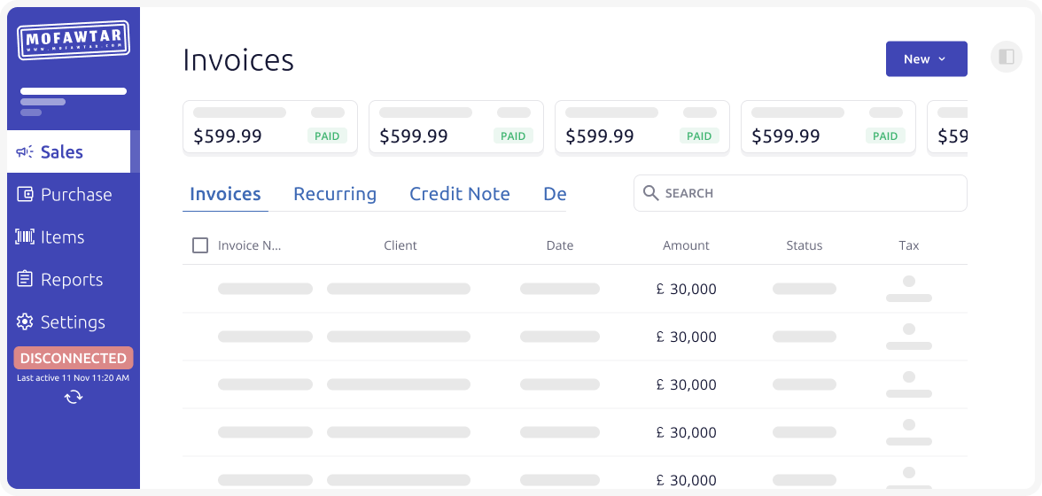 أرسل فواتير تحمل علامتك التجارية بالعربية أو الإنجليزية، وطبّق الضرائب والخصومات بدقة، وتابع كل خطوة من "تم الإرسال" إلى "تم الدفع". أنشئ قوالب ذكية مرة واحدة، واضبط الفواتير الدورية، وأتمت التذكيرات حتى لا تضطر لملاحقة المدفوعات مجددًا.