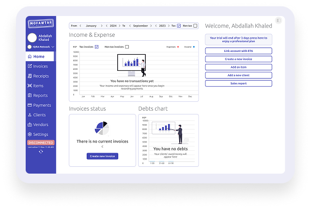 Mofawtar E-Invoicing Solution is a modern, user-friendly platform that enables users to issue tax-compliant invoices and e-receipts, integrate with ETA’s system, and track payments with ease.